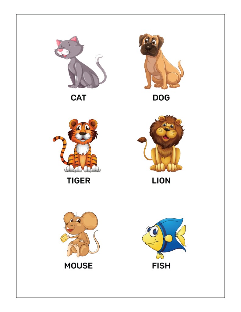As the name suggests, this worksheet includes the most basic and common animals like cat, dog, tiger, lion, mouse, and fish. This will help children in identifying these animals and they can start using them too. Download the sheet in 8 languages with the links given below.