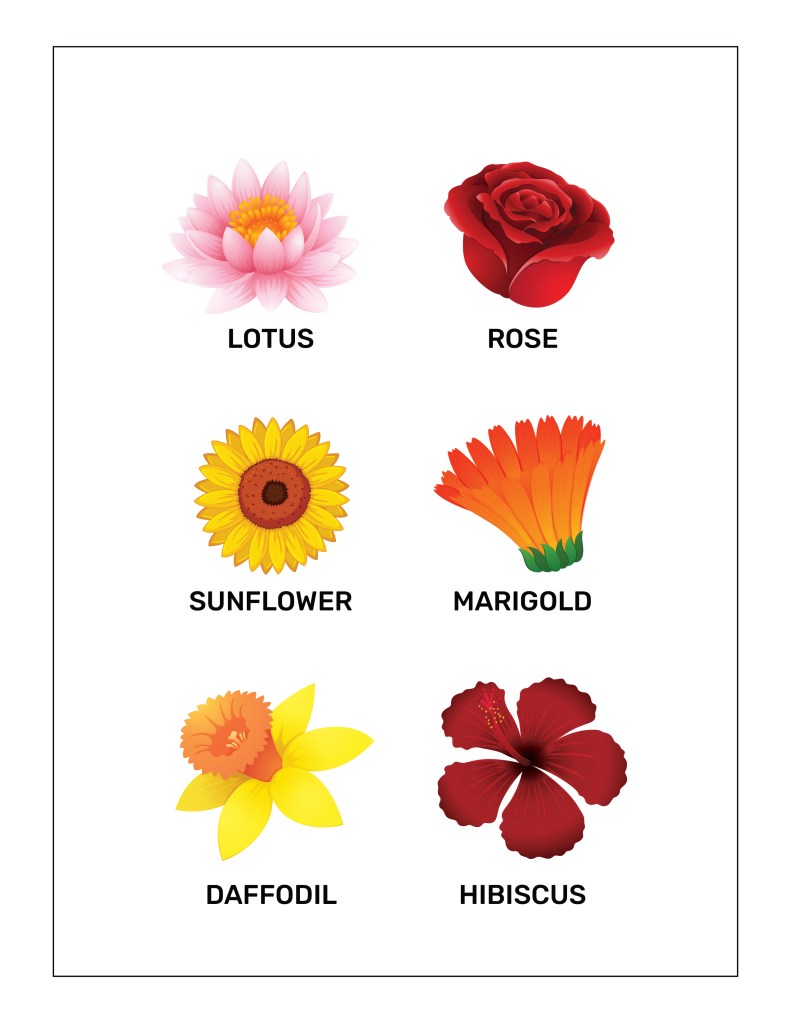 As the name suggests, this worksheet includes the most basic and common flowers like rose, sunflower, daffodil, marigold, lotus, and hibiscus. This will help children in identifying these flowers and they can start drawing them too. Download the sheet in 8 languages with the links given below.
