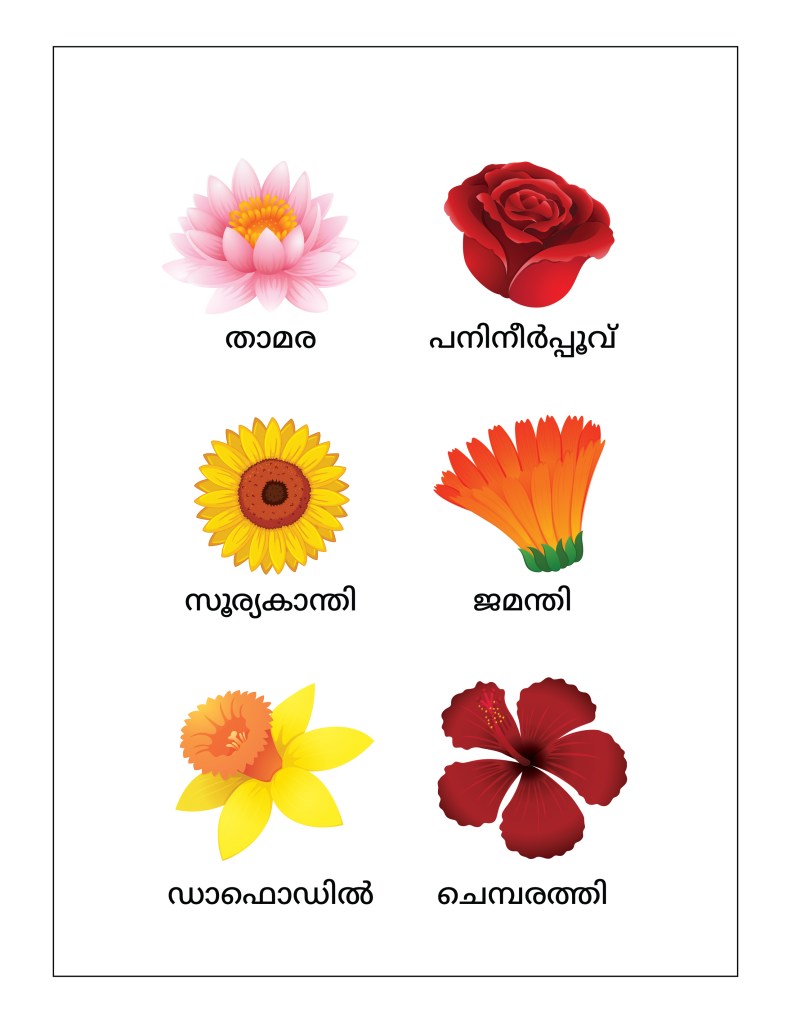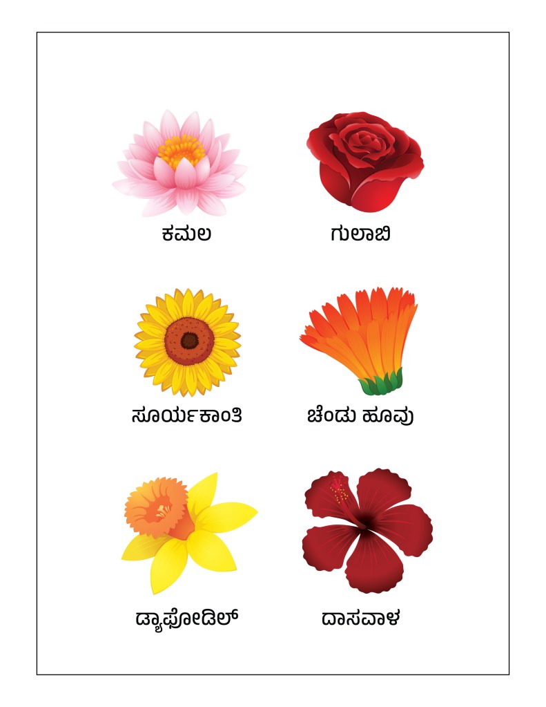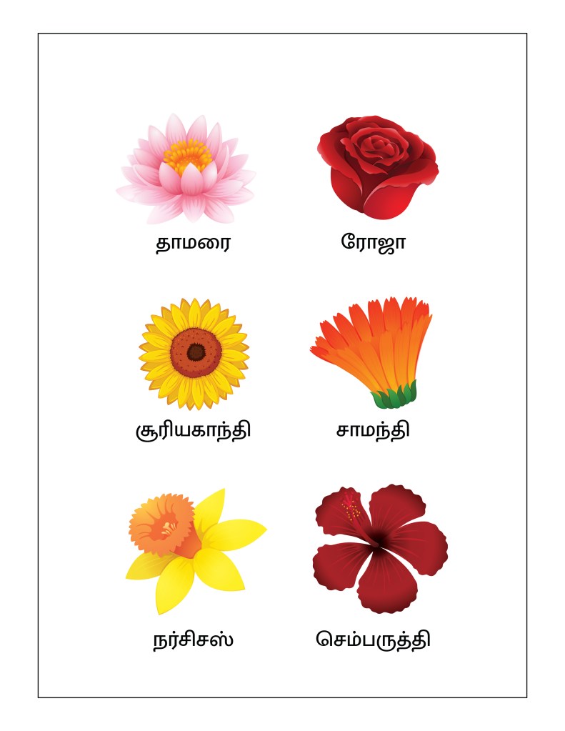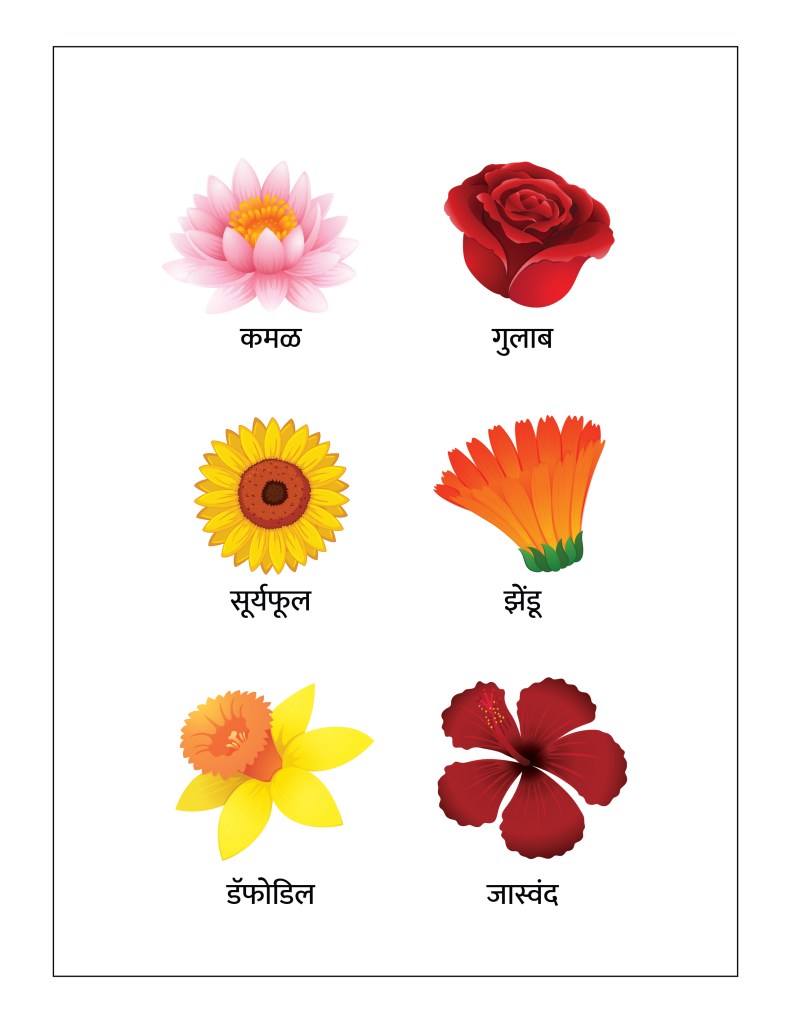 To help children in learning their flowers, today we are providing the Common Flowers Worksheet, in 8 different languages – English, Hindi, Marathi, Gujarati, Bengali, Tamil, Malayalam, and Kannada.