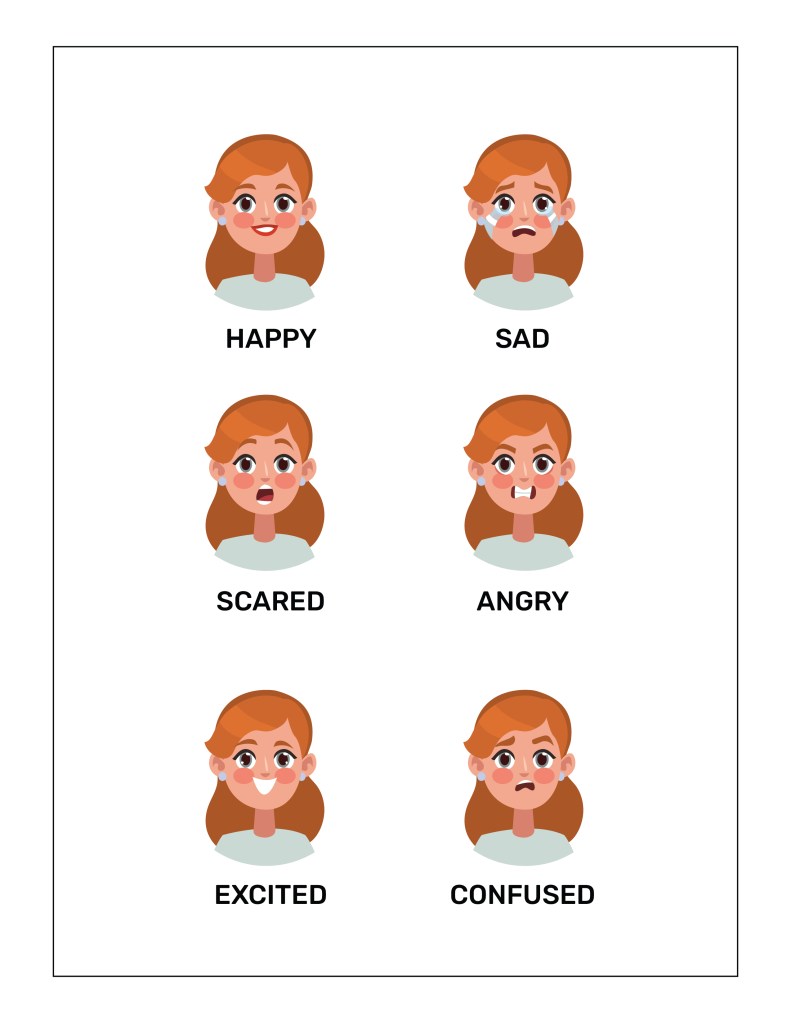 - Recite the names of the feelings to your child. Then ask the child to make its expression and say its name out loud.
